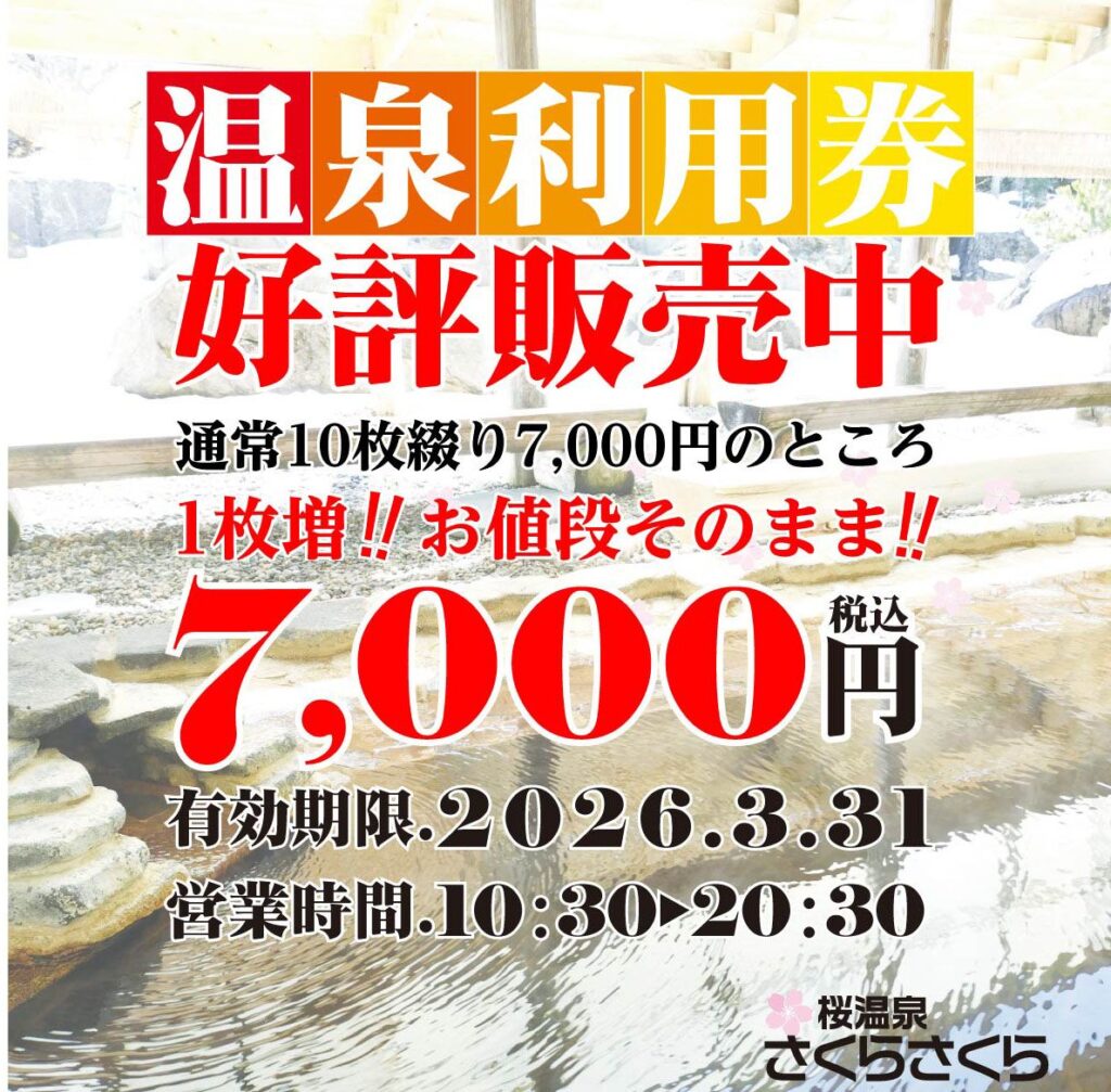 いつも桜温泉さくらさくらをご利用頂き、ありがとうございます。上記の通り、お得な温泉利用券を販売いいたします。是非、この機会にご利用ください。