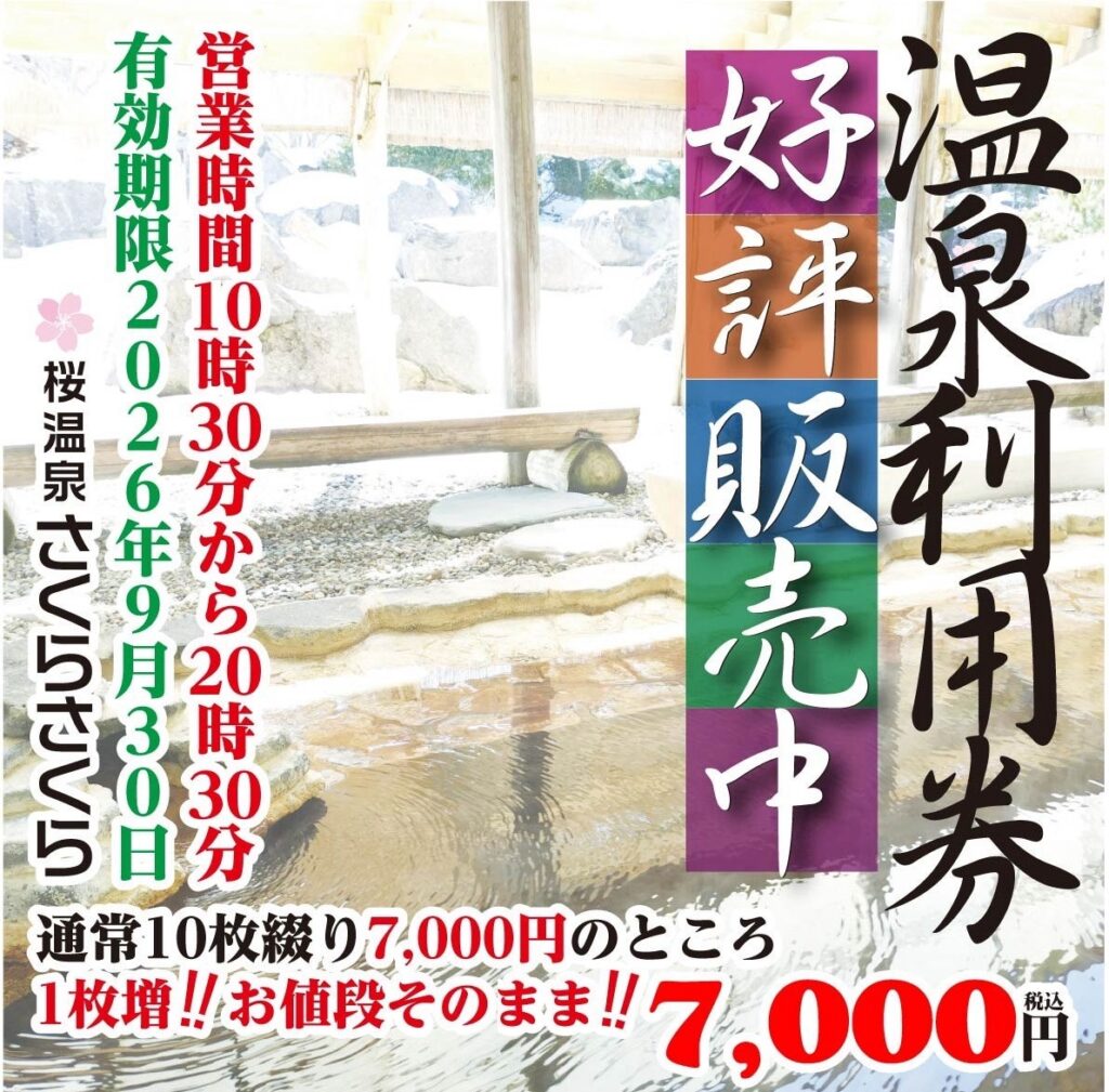 【桜温泉】温泉利用券販売のお知らせ お知らせ 2026.03.15 いつも桜温泉さくらさくらをご利用いただき、誠にありがとうございます。 上記の通り、お得な温泉利用券を販売しております。 是非、この機会にご利用ください。